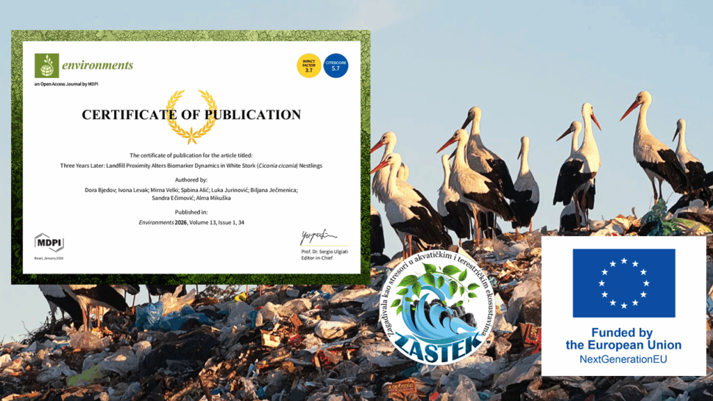 S ponosom dijelimo vijest o znanstvenim rezultatima ostvarenima u okviru projekta ZASTEK (Zagađivala kao stresori u akvatičkim i terestričkim ekosustavima), financiranog od Europske unije kroz program NextGenerationEU. Rezultati istraživanja objavljeni su u znanstvenom časopisu Environments ( Q1, IF 3,7) u radu: Bjedov, D., Levak, I., Velki, M., Alić, S., Jurinović, L., Ječmenica, B., Ečimović, S. & Mikuška, A. (2026). Three Years Later: Landfill Proximity Alters Biomarker Dynamics in White Stork (Ciconia ciconia) Nestlings.